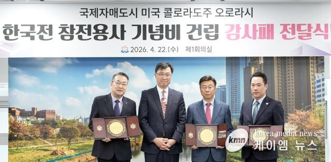 (케이엠뉴스) 성남시가 22일 오후 2시 미국 콜로라도주 오로라시의 ‘한국전 참전용사 기념비’ 건립에 기여한 공로를 인정받아 오로라시 한국전참전용사기념비건립위원회로부터 감사패를 받았다.