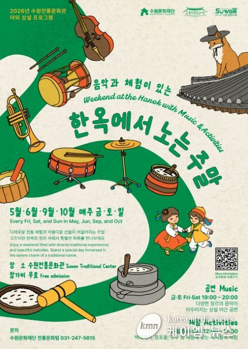 (케이엠뉴스) 수원문화재단은 오는 5월부터 10월까지 수원전통문화관에서 음악과 전통 체험이 결합 된 야외 상설 프로그램 ‘한옥에서 노는 주말’을 운영한다.