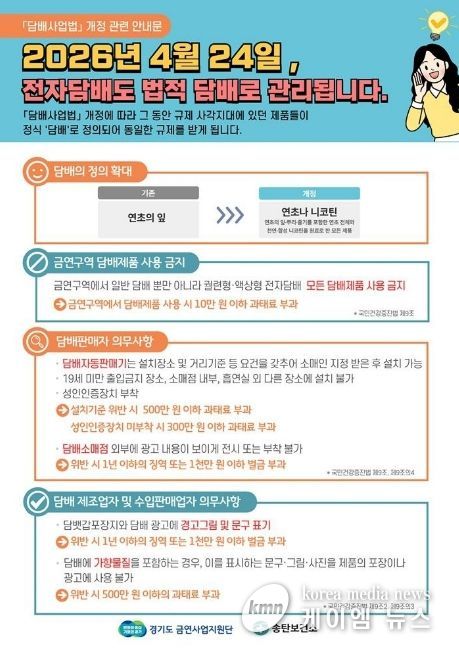 (케이엠뉴스) 평택시는 2026년 4월 24일부터 시행되는 개정 '담배사업법'에 따라 전자담배를 포함한 모든 니코틴 제품이 ‘담배’로 규정되며, 금연구역 내 전자담배 흡연 시 과태료 10만 원이 부과된다고 밝혔다.