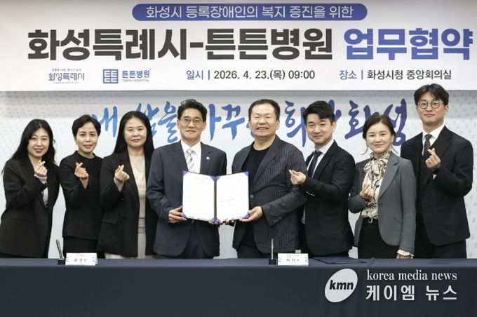 (케이엠뉴스) 화성특례시는 23일 본관 2층 중앙회의실에서 튼튼병원과 화성시 등록장애인의 건강한 생활 지원과 삶의 질 향상을 위한 업무협약을 체결했다.