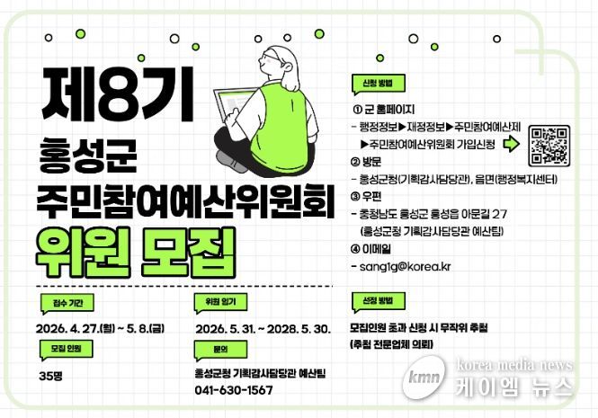 (케이엠뉴스) 홍성군이 군정 재정운영에 군민의 목소리를 직접 담아낼 제8기 주민참여예산위원회 위원을 4월 27일부터 5월 8일까지 공개모집한다.