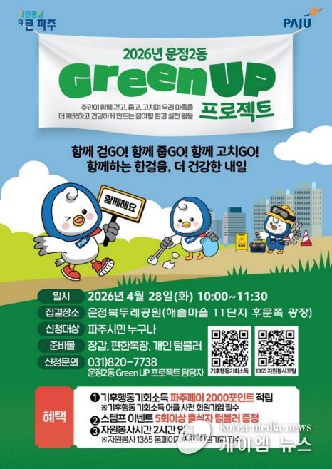 (케이엠뉴스) 파주시 운정2동은 오는 28일 10시부터 운정 북두레공원에서 주민과 함께하는 시민 참여형 환경·건강 프로그램 ‘제3회 그린 업(Green UP) 프로젝트’를 개최한다.