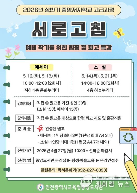 (케이엠뉴스) 인천광역시교육청중앙도서관은 4월 27일부터 예비 작가를 위한 ‘중앙저자학교 고급과정’ 참여자를 모집한다.