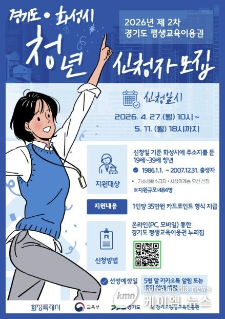 (케이엠뉴스) 화성특례시는 청년층의 자기계발과 역량 강화를 지원하기 위해 ‘2026년 평생교육이용권 지원사업’ 지역특화(청년) 분야 2차 이용자를 모집한다고 밝혔다.