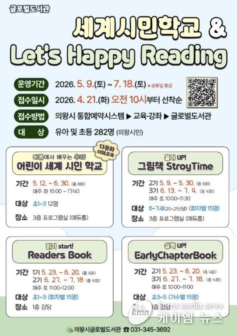 (케이엠뉴스) 의왕시 글로벌도서관이 책을 통해 세상을 이해하고 체험하는 다문화 이해 프로그램 '어린이 세계 시민 학교'와 영어 읽기 문해력 향상을 위한 단계별 맞춤 프로그램 'Let’s Happy Reading'의 참여자를 모집한다.