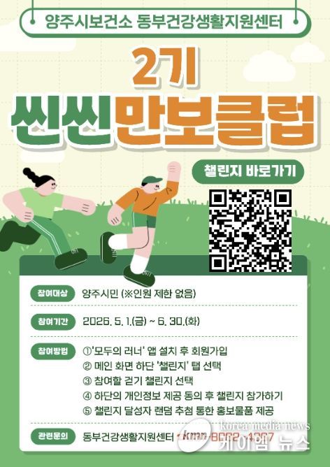 (케이엠뉴스) 양주시보건소 동부 건강생활지원센터에서 지역 주민의 건강생활실천율 향상과 비만율 개선을 위해 ‘2026년도 씬씬 만보클럽 2기’ 참여자를 모집한다.