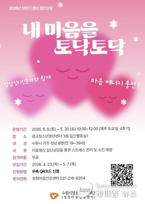 (케이엠뉴스) 수원시청소년청년재단 청청마음건강센터는 학업과 취업준비, 직장생활 등 경쟁 중심 환경으로 인해 심리적 소진을 겪는 관내 청년들을 대상으로, 오는 5월 7일까지 전문가가 참여하는 집단상담 프로그램 ‘내 마음을 토닥토닥’ 참가자를 모집한다고 밝혔다.