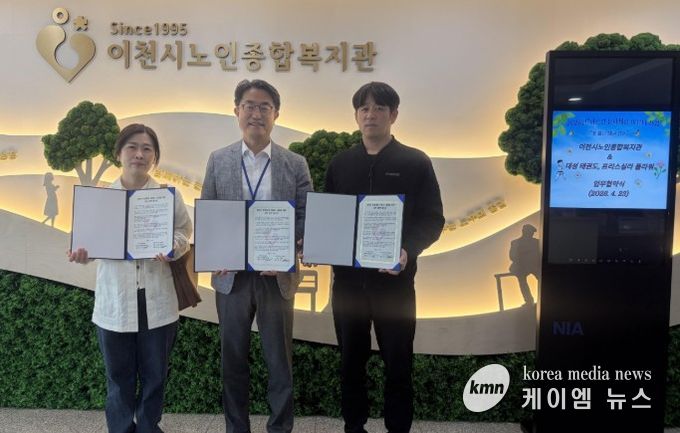(케이엠뉴스) 이천시는 지난 4월 23일, 이천시 노인종합복지관에서 대성태권도과와 프리스실라 플라워와 함께 지역사회 어르신들의 복지 증진과 통합적 지원 체계 구축을 위한 ‘어르신 문화체육 이음터사업’ 업무협약(MOU)을 체결했다고 밝혔다.