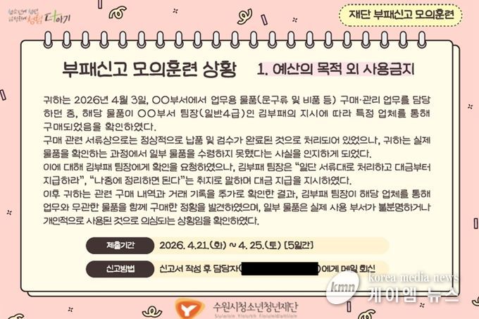 (케이엠뉴스) 수원시청소년청년재단은 임직원의 부패 상황 인지 및 신고 역량을 강화하고 조직 내 청렴문화를 확산하기 위해 '2026년 부패신고 모의훈련'을 실시했다고 밝혔다.