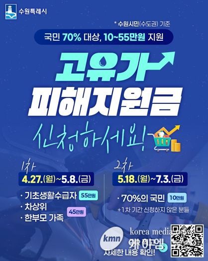 (케이엠뉴스) 수원특례시가 ‘고유가 피해지원금 태스크포스팀’을 운영해 시민들이 지원금을 원활하게 신청할 수 있도록 지원한다. 1차 태스크포스팀은 4월 20일부터 5월 8일까지, 2차는 5월 11일부터 7월 31일까지 운영한다.