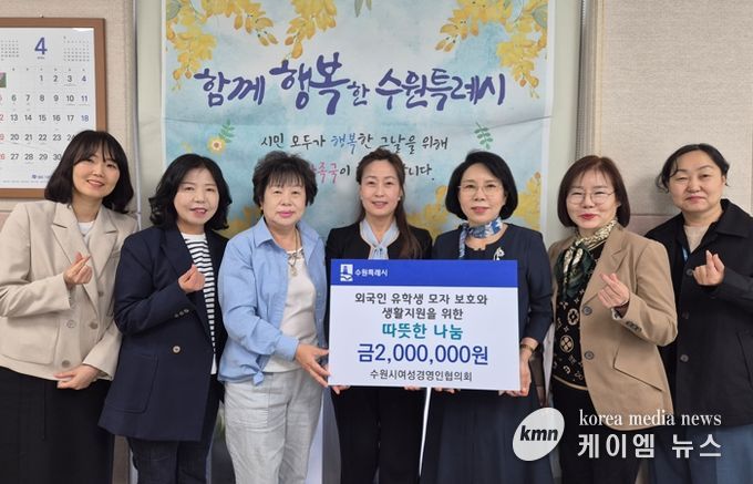 (케이엠뉴스) 수원시 여성경영인협의회는 “한국으로 유학 온 뒤 미혼모로 출산한 외국인 유학생과 신생아의 안정적인 생활을 돕는 데 사용해 달라”며 24일 수원시에 200만 원을 전달했다.