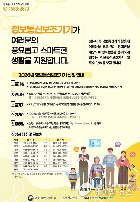 (케이엠뉴스) 강원특별자치도는 장애인 등 디지털 취약계층의 정보 접근성을 높이고 디지털 이용 격차를 해소하기 위해 ‘2026년 정보통신보조기기 보급 지원사업’ 신청을 받는다.