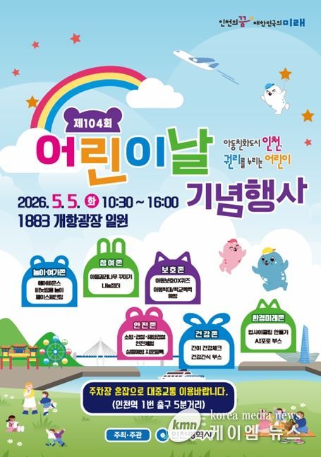 (케이엠뉴스) 인천광역시는 제104회 어린이날을 맞아 어린이의 권리 존중과 참여 확대를 위한 기념행사를 오는 5월 5일 오전 10시 30분부터 오후 4시까지 중구 북성동 ‘1883 개항광장 일원’에서 개최한다고 밝혔다.