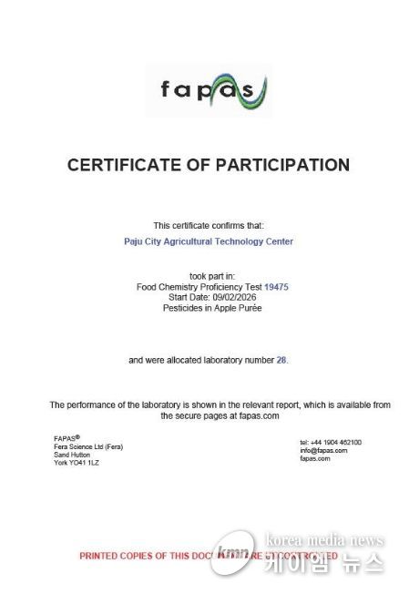 (케이엠뉴스) 파주시 농산물 안전분석실이 국제적으로 공신력 있는 잔류농약 분석 능력 평가에서 4년 연속 우수한 결과를 달성하며 세계 수준의 분석 역량을 입증했다.