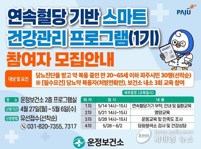 (케이엠뉴스) 파주시 운정보건소는 심뇌혈관질환 예방관리사업의 일환으로 ‘연속혈당 기반 스마트 건강관리 프로그램’참여자를 오는 27일부터 10일간 모집한다.
