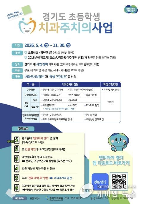 (케이엠뉴스) 안산시는 경기도와 협력해 관내 초등학교 4학년 학생을 대상으로 ‘초등학생 치과주치의 사업’을 추진한다고 27일 밝혔다.