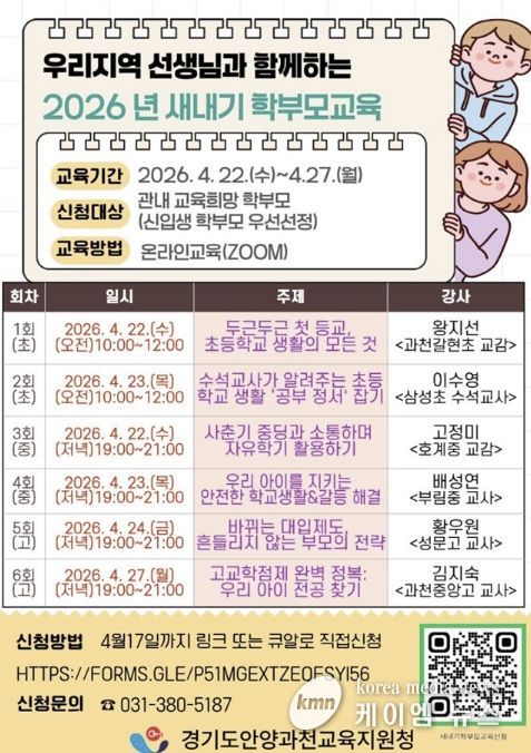 (케이엠뉴스) 경기도안양과천교육지원청은 오는 4월 22부터 27일까지 관내 신입생 학부모를 대상으로 ‘우리지역 선생님과 함께하는 2026년 새내기 학부모 교육’을 개최한다.