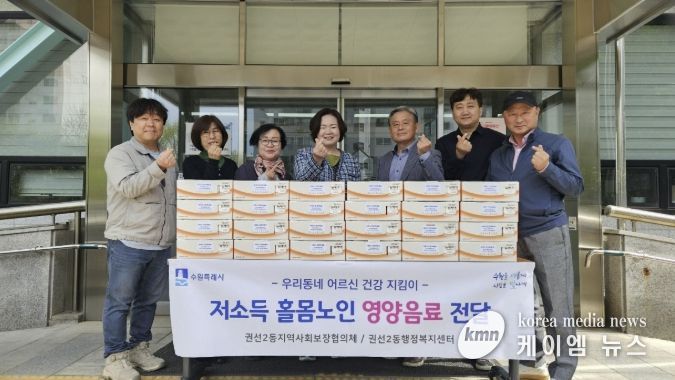 (케이엠뉴스) 수원시 권선구 권선2동 지역사회보장협의체는 지난 23일, 저소득 홀몸노인 건강증진과 정서적 안정을 위한 “우리 동네 어르신 건강지킴이 영양음료 전달사업”을 진행했다.