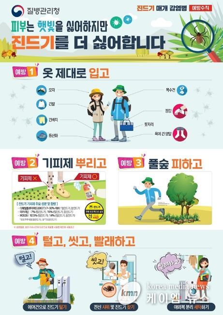 (케이엠뉴스) 의정부시 보건소는 따뜻한 날씨로 농작업, 등산, 캠핑 등 야외활동이 본격화됨에 따라 진드기 매개 감염병 예방수칙 준수를 시민들에게 당부했다.