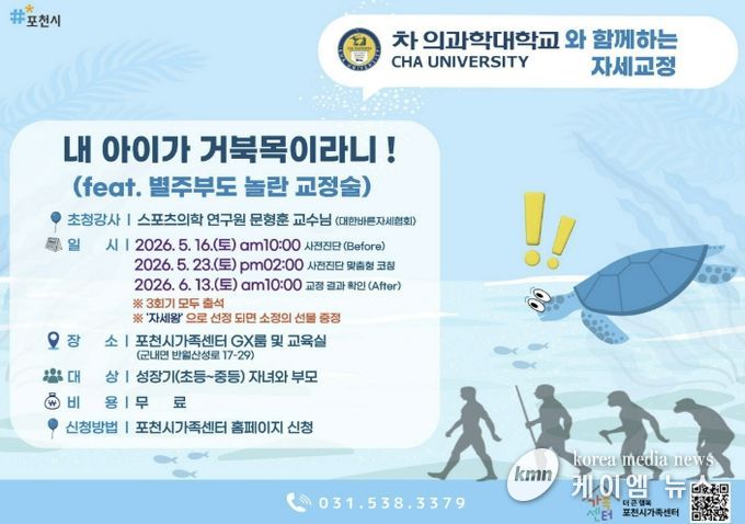 (케이엠뉴스) 포천시 더 큰 행복 포천시가족센터는 오는 5월 16일부터 6월 13일까지 성장기 자녀를 둔 가족을 대상으로 부모역할지원사업 ‘내 아이가 거북목이라니! feat.별주부도 놀란 교정술’ 프로그램을 운영한다.