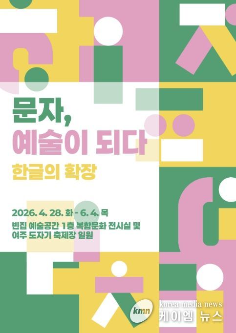 (케이엠뉴스) 여주세종문화관광재단은 오는 4월 28일부터 6월 4일까지 빈집 예술공간 1층에서 기획전시 《문자, 예술이 되다 - 한글의 확장》를 개최한다고 밝혔다.