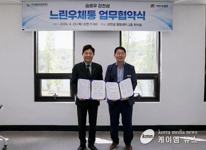 (케이엠뉴스) 여주세종문화관광재단과 여주우체국은 4월 23일 강천섬 힐링센터에서 ‘슬로우 강천섬 느린우체통 업무협약(MOU)’을 체결했다. 빠르게 흘러가는 일상 속에서 잠시 걸음을 멈추고, 소중한 사람에게 미래의 마음을 전할 수 있는 감성 관광콘텐츠를 공동으로 운영하기 위해서다.