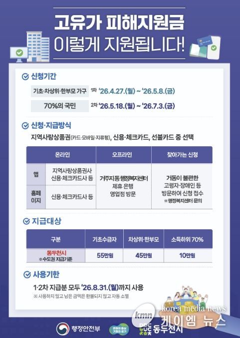 (케이엠뉴스) 동두천시가 중동발 고유가와 고물가로 인한 시민 부담을 완화하고 지역경제 회복을 지원하기 위해 ‘고유가 피해지원금’을 지급한다.