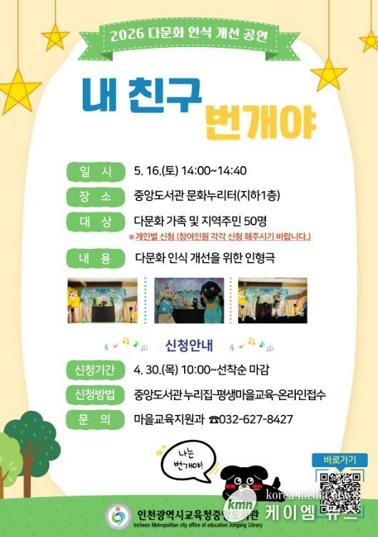 (케이엠뉴스) 인천광역시교육청중앙도서관은 오는 5월 16일 다문화 인식 개선 공연 ‘내 친구 번개야’를 운영한다.