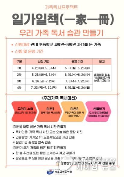 (케이엠뉴스) 속초교육도서관은 2026년 5월부터 8월까지 가족이 함께 책을 읽고 소통하는 독서문화 확산을 위해 가족 독서 프로젝트 ‘일가일책(一家一冊)’을 운영한다.