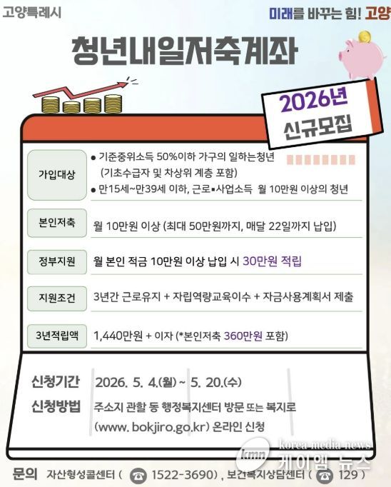 (케이엠뉴스) 고양특례시는 5월 4일부터 시작하는 청년내일저축계좌 신규 가입자 모집을 앞두고, 가입 독려에 나섰다.