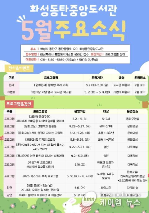(케이엠뉴스) 화성동탄중앙도서관이 어린이날과 가정의 달을 맞아 5월 한 달간 도서관 이용자와 시민을 대상으로 자료실과 3층 공공의 마당 등에서 다양한 문화행사를 운영한다.