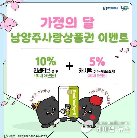 (케이엠뉴스) 남양주시는 남양주사랑상품권 인센티브 예산을 확대하고 5월 가정의 달을 맞아 특별 혜택을 제공한다고 27일 밝혔다.