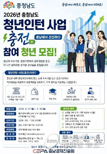 (케이엠뉴스) 충남도는 도내 청년들의 실질적인 직무 경험과 취업 경쟁력을 높이기 위해 ‘2026년 충청남도 청년인턴 사업(충전: 충남에서 전진하다)’ 참여 청년을 모집한다고 28일 밝혔다.