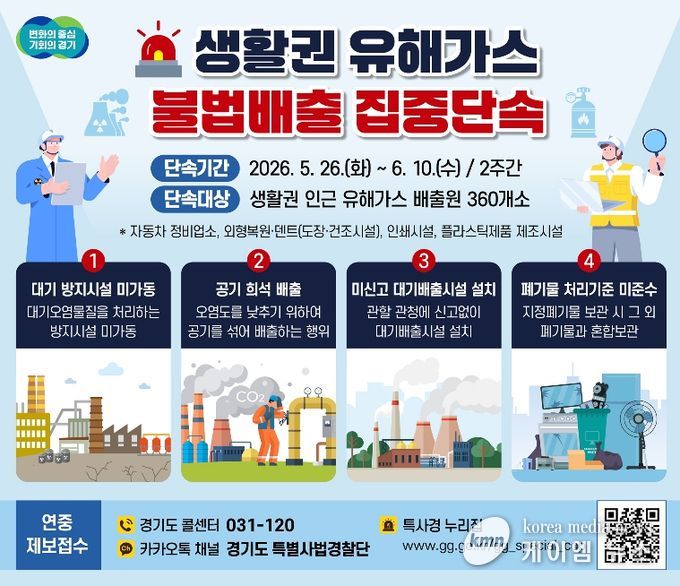 (케이엠뉴스) 경기도 특별사법경찰단이 5월 26일부터 6월 10일까지 2주간 주거지·학교·병원 등 생활권 인근 지역의 유해가스 배출 사업장을 대상으로 불법행위를 집중단속 한다.