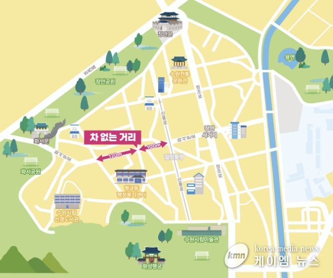 (케이엠뉴스) 수원시 행궁동 화서문로 34번지부터 신풍로 47번지까지 약 220m 구간이 5월부터 매주 토요일 ‘차 없는 거리’로 운영된다.