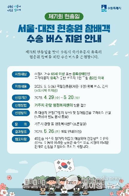 (케이엠뉴스) 수원특례시가 제71회 현충일인 6월 6일, 국립현충원(서울·대전)까지 이동이 여의치 않은 국가유공자 유족을 위해 현충원 왕복 수송버스를 운행한다.