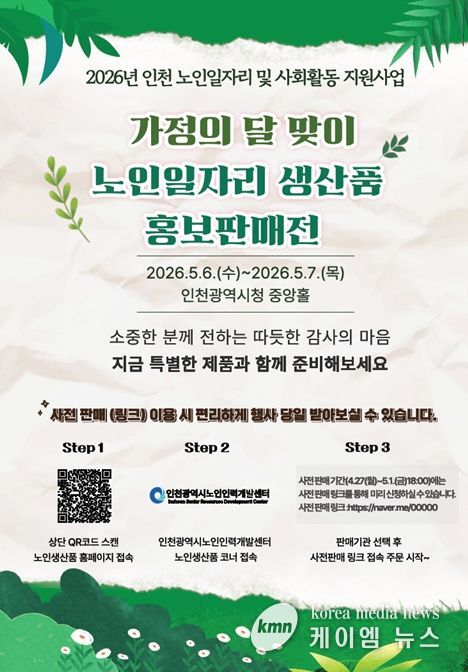 (케이엠뉴스) 인천시가 2026년 노인일자리 사업을 대폭 확대하고, 5월 가정의 달을 맞아 어르신들이 직접 제작한 생산품을 시민들에게 선보이는 홍보·판매 행사를 개최한다.