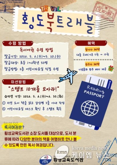 (케이엠뉴스) 횡성교육도서관은 5월 6일부터 6월 30일까지 어린이들의 자발적인 독서 습관 형성과 도서관 이용 활성화를 위해 독서 여권을 활용한 ‘횡도북트래블’ 프로그램을 운영한다고 밝혔다.