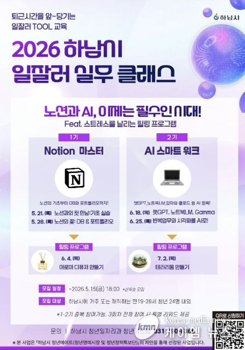 (케이엠뉴스) 하남시는 관내 청년들이 현장에서 바로 활용할 수 있는 실무 역량을 키우고 또래 청년 간 교류 기회를 확대하기 위해 오는 5월부터 ‘2026년 하남시 일잘러 실무클래스’를 운영하고 1기와 2기 참여자를 모집한다고 밝혔다.