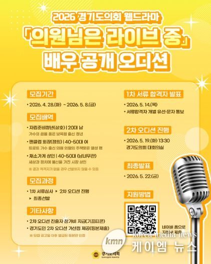 (케이엠뉴스) 경기도의회는 2026년도 경기도의회 웹드라마 ‘의원님은 라이브 중(가제)’에 출연할 배우를 공개 모집하기 위해 오디션을 개최한다.