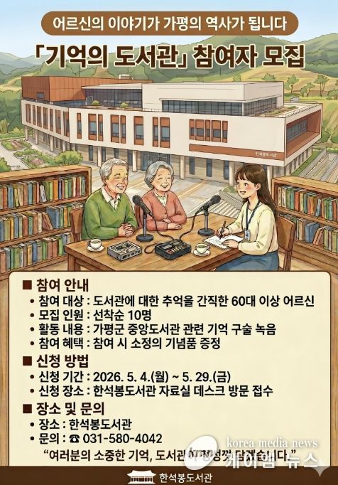 (케이엠뉴스) 가평군 한석봉도서관이 오는 5월부터 어르신들의 생생한 목소리로 지역의 옛 기록을 수집하는 ‘기억의 도서관’ 프로그램을 운영한다. 실버층 특화 사업인 ‘말랑말랑 추억 교실’의 일환으로 추진되는 이번 사업은 지역 문화 자산을 확보하고 세대 간 기억을 공유하고자 기획됐다.