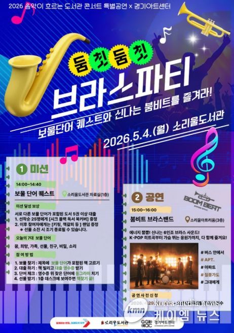 (케이엠뉴스) 오산시 소리울도서관은 제104회 어린이날을 앞둔 오는 5월 4일 경기아트센터와 협업해 ‘2026 음악이 흐르는 도서관 콘서트’ 특별공연인 ‘둠칫둠칫 브라스 파티’를 개최한다고 밝혔다.