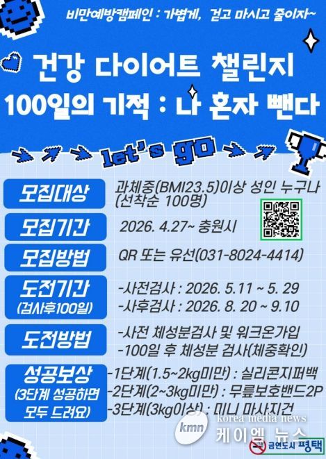(케이엠뉴스) 평택시는 시민들이 스스로 비만 관리 능력을 키우고 건강한 생활 습관을 정착시킬 수 있도록 돕는 비만 예방 프로그램 '100일의 기적’참가자를 모집한다고 밝혔다.