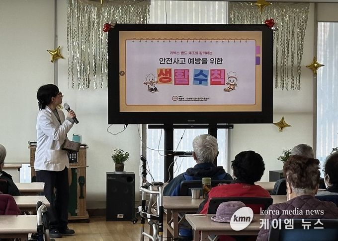 이번 교육은 일상생활에서 발생할 수 있는 안전사고 예방을 주제로, 기본 생활 수칙 안내와 함께 인공지능(AI) 트로트 음악에 맞춘 라텍스 밴드 생활 체조 활동으로 구성됐다. 참여자들은 음악에 맞춰 체조를 따라 하며 자연스럽게 신체활동에 참여하고, 퀴즈를 통해 교육 내용을 쉽고 재미있게 익히고 있다.