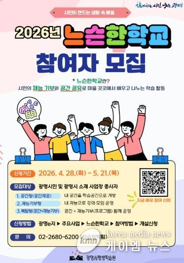 (케이엠뉴스) 광명시가 시민이 직접 가르치고 배우는 시민참여형 평생학습 프로그램 ‘느슨한학교’ 신규 운영자를 오는 5월 21일까지 모집한다.
