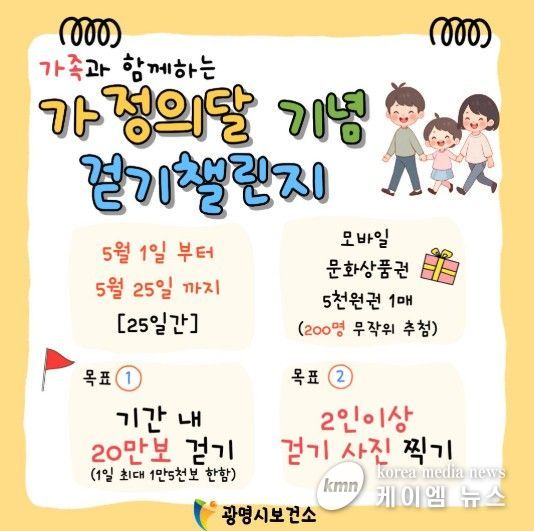 (케이엠뉴스) 광명시가 오는 5월 가정의 달을 맞아 시민 건강을 증진하고 가족 유대를 강화하고자 ‘2026년 가정의 달 기념 걷기 챌린지’를 운영한다.