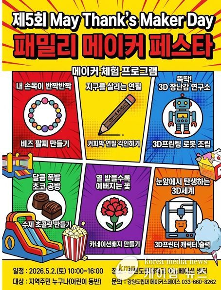 (케이엠뉴스) 강원도립대학교는 5월 가정의 달을 맞아 가족 참여형 체험 행사인 ‘패밀리 메이커 페스타’를 오는 5월 2일 교내 이노베이션센터에서 개최한다.