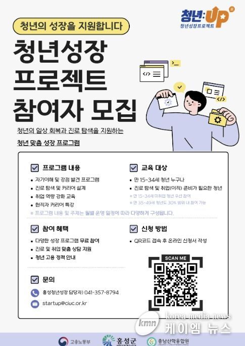 (케이엠뉴스) 홍성군이 청년 취업과 진로 지원을 강화한다. 군은 고용노동부 ‘청년성장프로젝트’ 공모사업에 2년 연속 선정되며 지역 청년을 위한 성장 지원 프로그램을 확대 운영한다고 밝혔다.