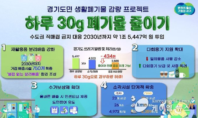 (케이엠뉴스) 수도권 직매립 금지에 따른 생활쓰레기 감량을 위해 경기도가 2030년까지 5년간 약 1조 5,447억 원을 투입하는 ‘하루 30g, 도민실천형 생활폐기물 감량 프로젝트’를 추진한다.