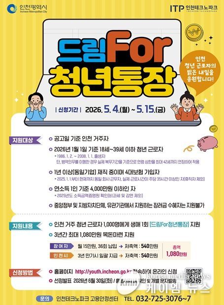 (케이엠뉴스) 인천광역시는 청년들이 안정적으로 미래를 설계하고 목돈을 마련할 수 있도록 지원하는 ‘드림For청년통장’ 사업 참여자를 오는 5월 4일부터 15일까지 모집한다고 밝혔다.